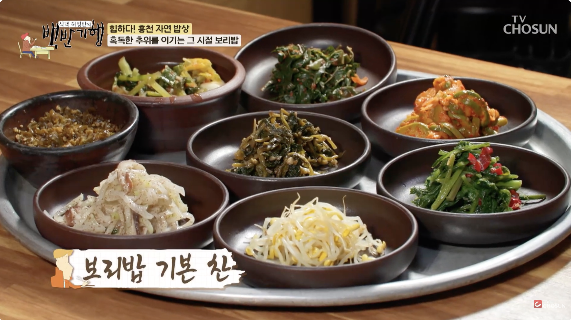 보리밥 하나에 딸려 나오는 나물 반찬만 해도 상이 가득 차는 구성.